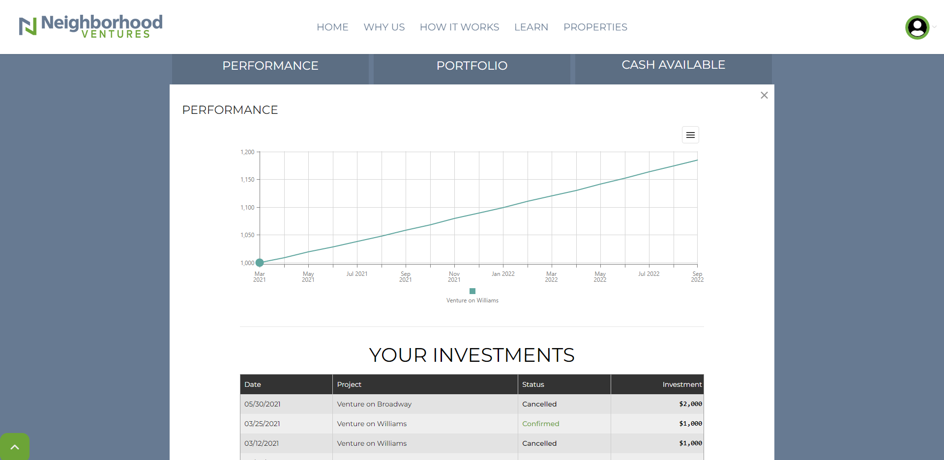 “At Neighborhood Ventures, we are always looking for ways to improve and be more innovative as well as transparent with our investors,” says Co-founder and CEO, Jamison Manwaring. “This new platform is designed to give investors a frictionless investment experience and to put the most relevant investment analytics at their fingertips.”